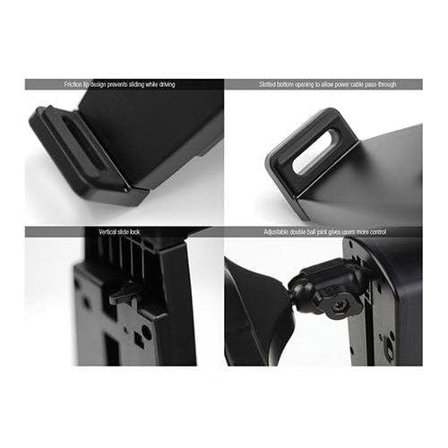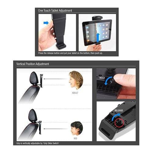 Once your tablet is installed, the ExoMount can be adjusted to accommodate passengers of all ages through built-in vertical slide lock and adjustable double ball joint features that let you to rotate, swivel, tilt, raise and lower the screen display to find optimal positions in both landscape and portrait formats.